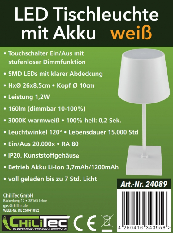 Hochwertige elegante Akku-Tischleuchte ideal für den romatischen Lichtschein beim Dinner oder auch als Lese- und Stimmungslicht im Wohnbereich. Durch den langlebigen, kräftigen Akku jederzeit flexibel einsetzbar. Die Touch-Dimmfunktion ermöglich Ihnen die Einstellung der von Ihnen gewünschten Lichtverhältnisse je nach Verwendungszweck. Technische Details: